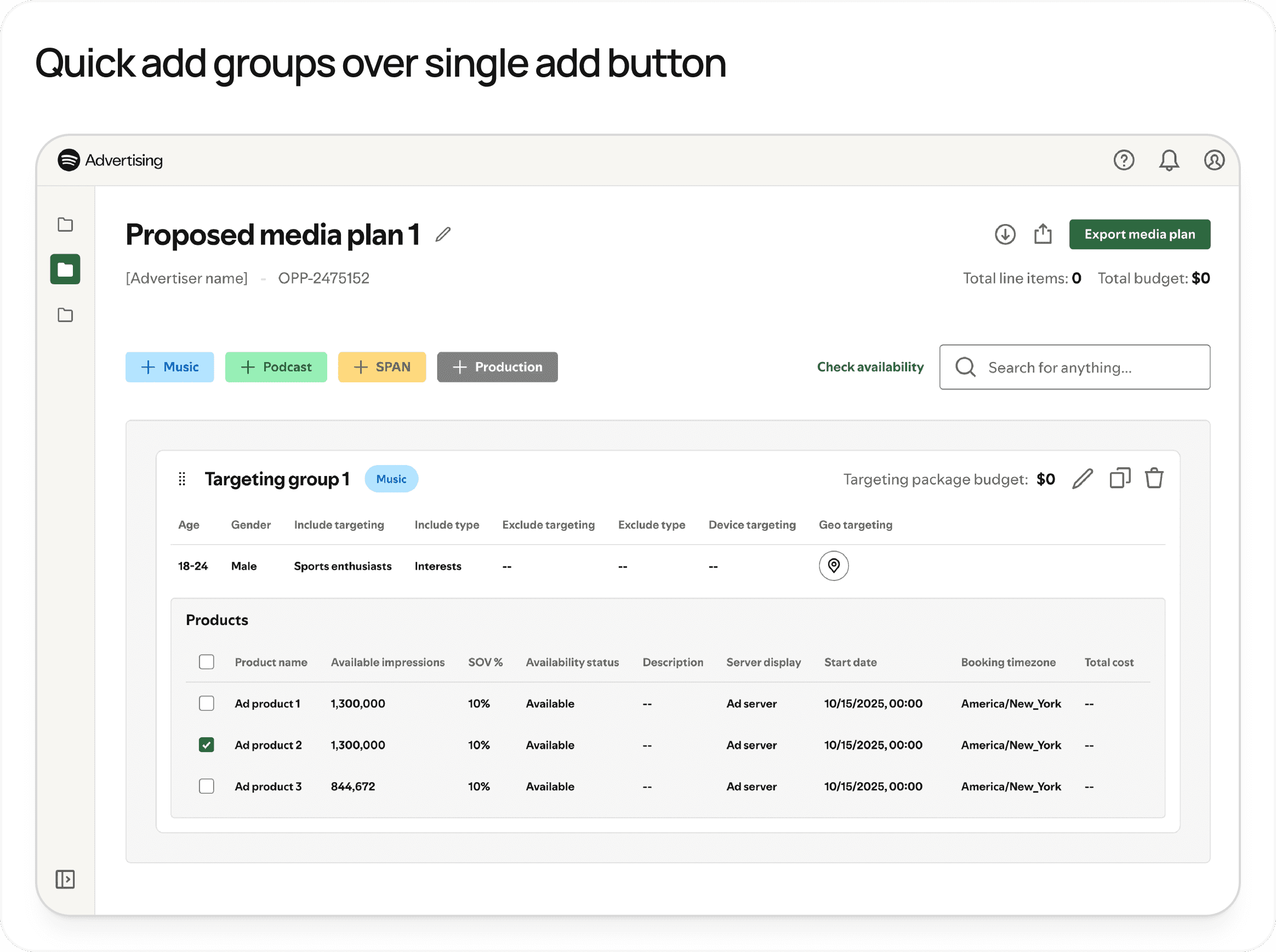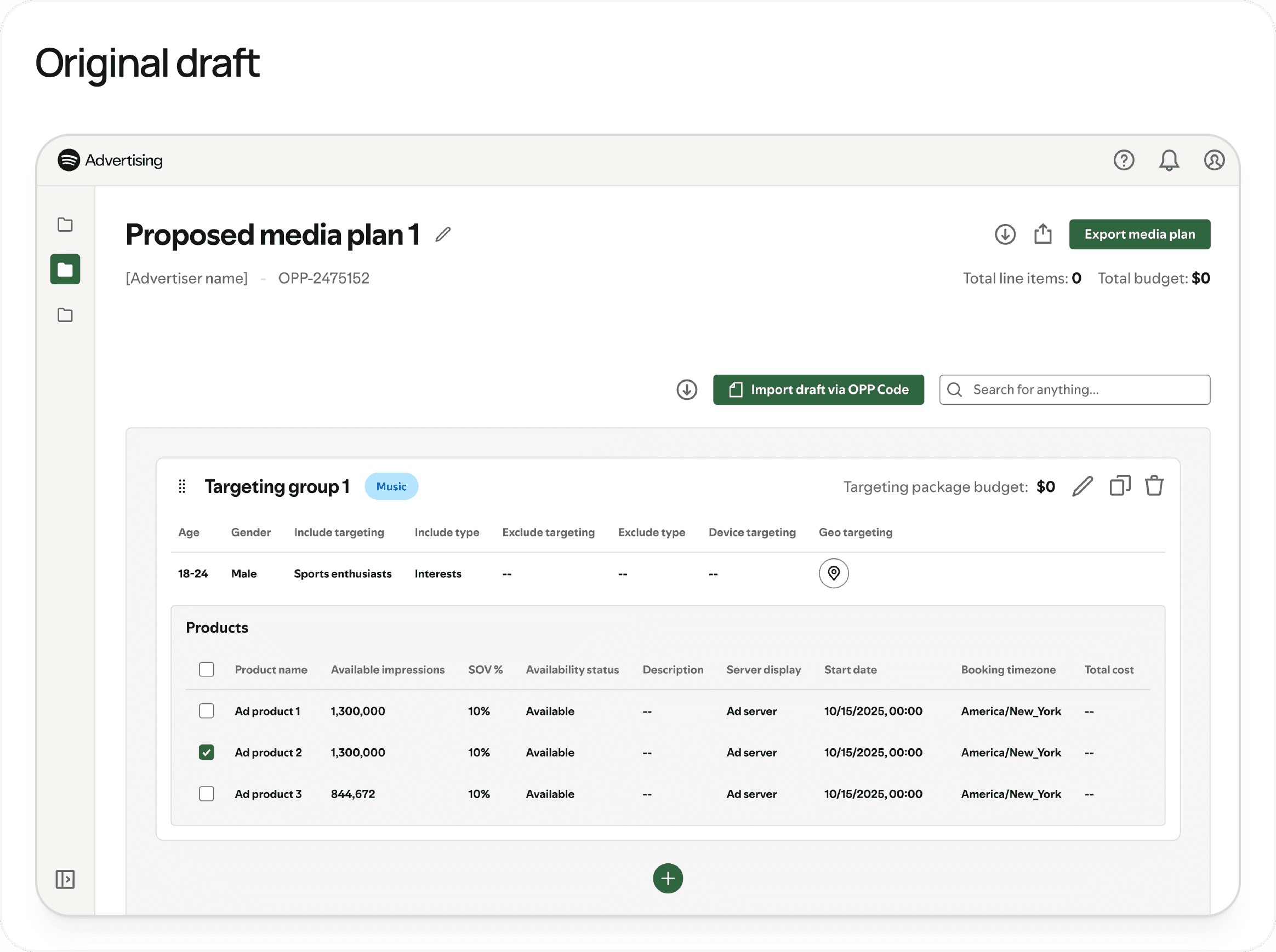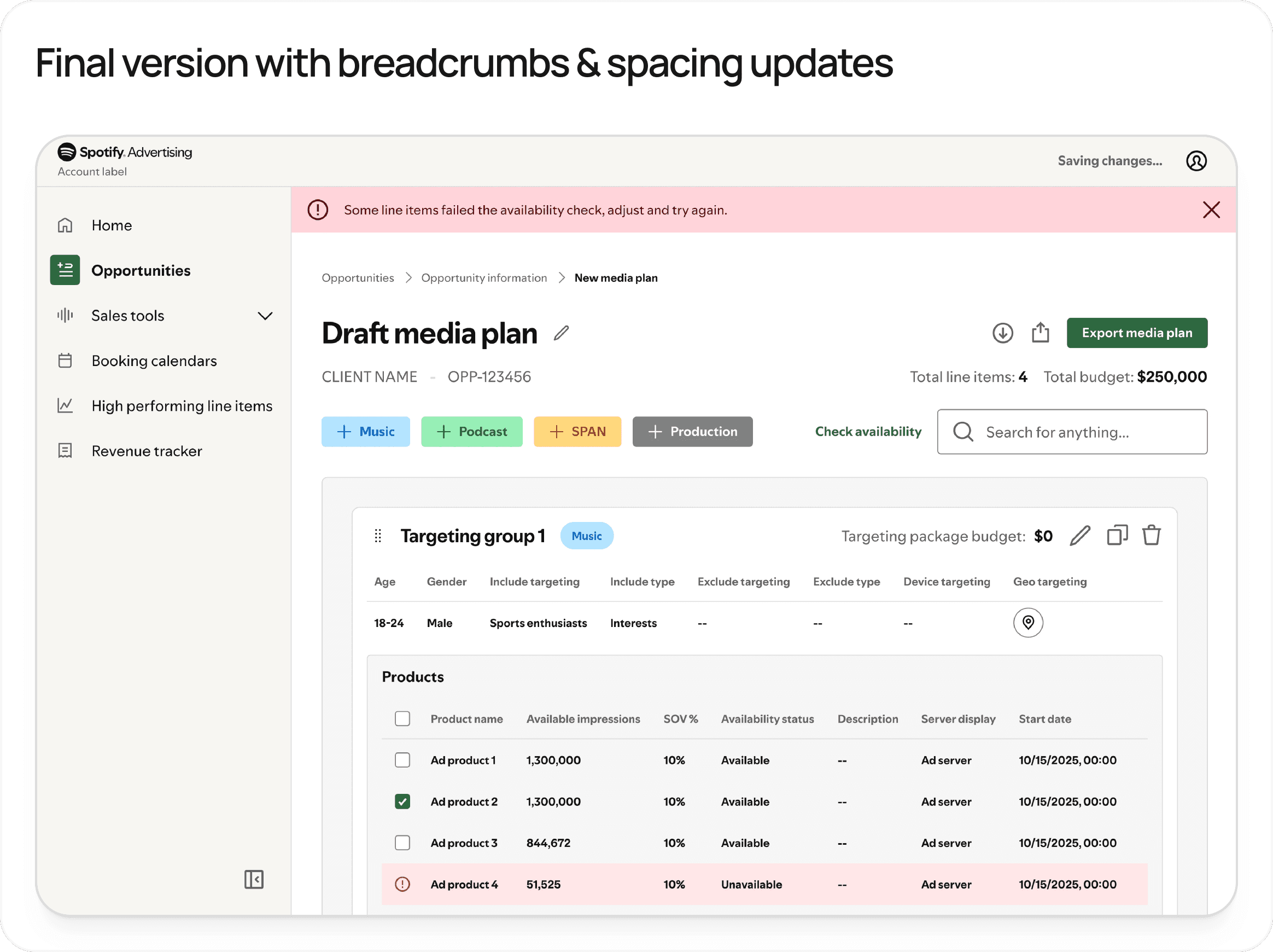 Media planning is the process that Spotify uses to determine when an ad will run, who it will target, and what type of format is used to convey a clients campaign message. When I joined the Tooling, Integrations, and Labs team at Spotify, our ad sales teams lacked a centralized platform for creating media plans for campaigns. This led to a few major issues: